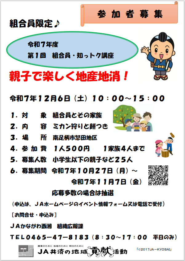 令和7年度、第1回組合員・知っトク講座『親子で楽しく地産地消!』を開催します。小学生以下の親子を対象にミカン狩りと餅つきなどを行います。