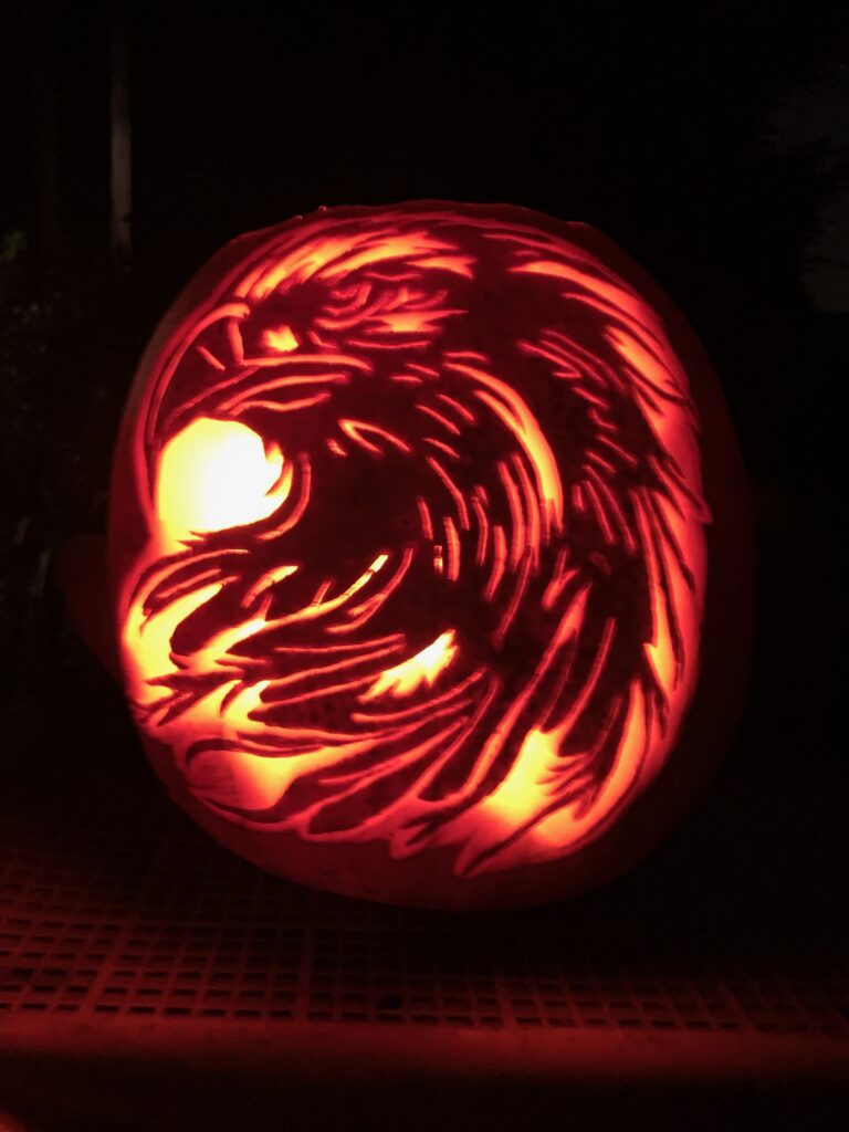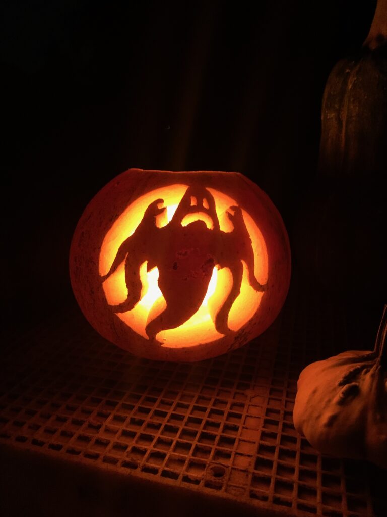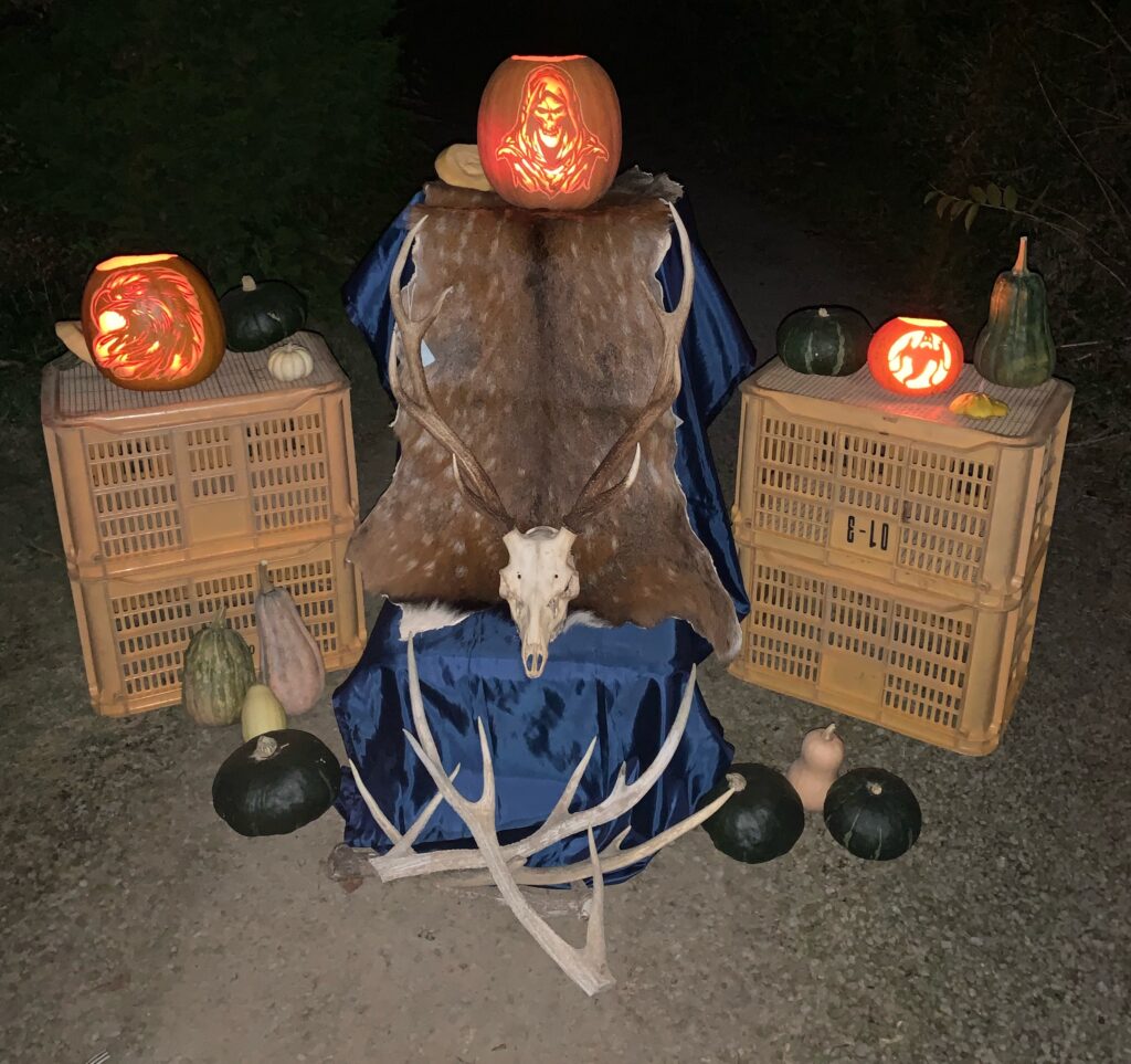 小田原市荻窪の廣川明子さんはハロウィンのジャックオーランタンを毎年作っています。今年は3個を制作。夜にはろうそくの火を灯して近所の人と一緒にハロウィンを楽しみました。ハロウィンの後のジャックオーランタンはしばらく久野支店に飾られています。