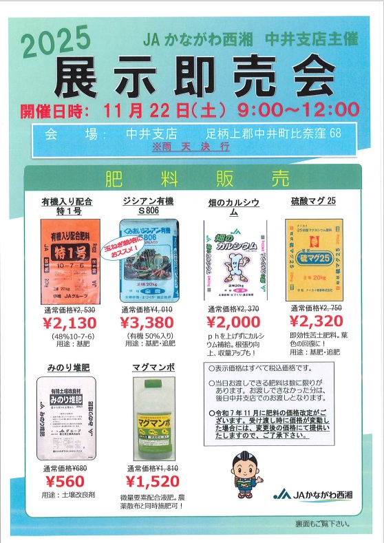 11月22日(土)に中井支店で展示即売会を開催します。肥料・除草剤・マルチを即売会価格で販売します。また、JAねっとショップ特設ブースを開設。ねっとショップへの登録をお手伝いをします!