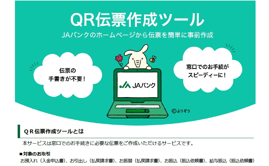 JAバンクではご利用者様の利便性の向上や窓口での手続き負担軽減のため、QR伝票作成ツールを開始いたしました。