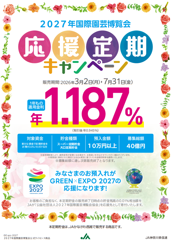 令和8年3月2日(月)より、「2027年国際園芸博覧会応援定期貯金」の取り扱いを開始いたします。